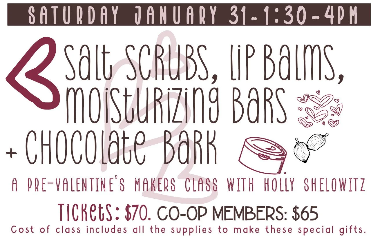 A Pre-Valentine’s Makers Class with Holly Shelowitz. Dark chocolate bark, heart-shaped moisturizing bars, pink Himalayan salt body scrub, and lip balm. Mmm.