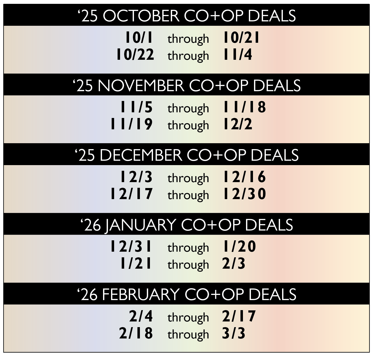 Co+op Deals run for 2 or 3 weeks at a time, beginning on a Wednesday. See below for dates through February 2026.